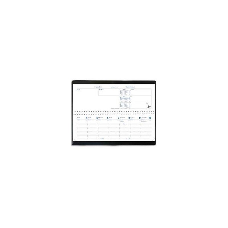 Agenda de bureau. Format 30 x 10 cm à l’italienne. 1 semaine sur 1 page de notes en vis-à vis. Couverture plastique grainée noire. Agendascop