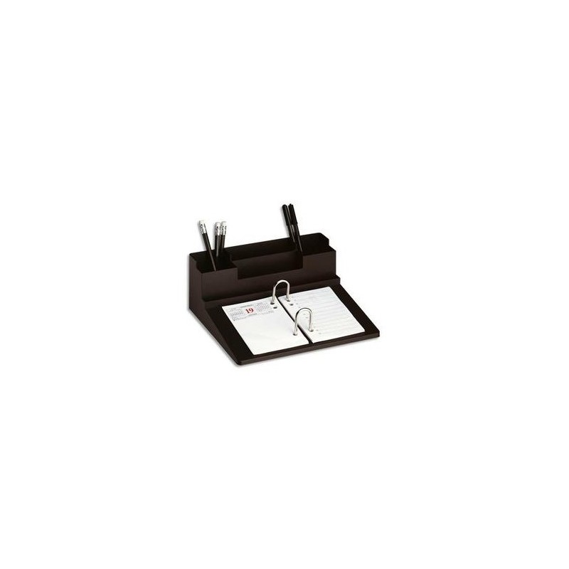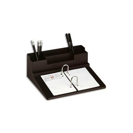 Livré sans bloc éphéméride. Noir. 2 anneaux métal. Rangements pour stylos, trombones... Dimensions de la base : 20 x 29 cm. Porte-bloc éphéméride.