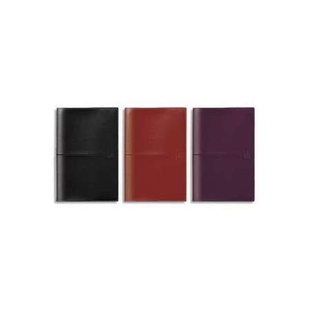 Finition maroquinerie, surpiqûre écrue. Couverture amovible. Coloris assortis, (noir, fauve, rouge, prune). Semainier spiralé, 1 semaine sur 2 pages avec zone de prise de notes. Grille Like Work. Voyage spirale.