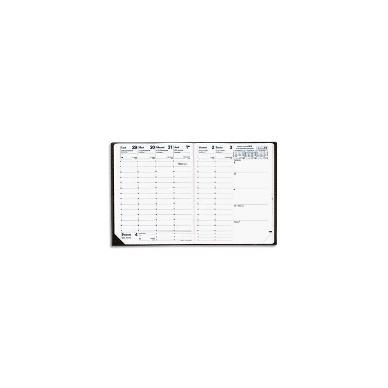 1 semaine sur 2 pages. Décembre à décembre : 13 mois. Couverture plastique grainée noire. Direction.
