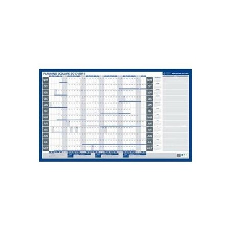 Planning 12 mois, de septembre à août, vacances scolaires, jours fériés, notes. Format 60 x 99 cm. Livré sous étui avec un feutre effaçable à sec. Plannings effaçables.