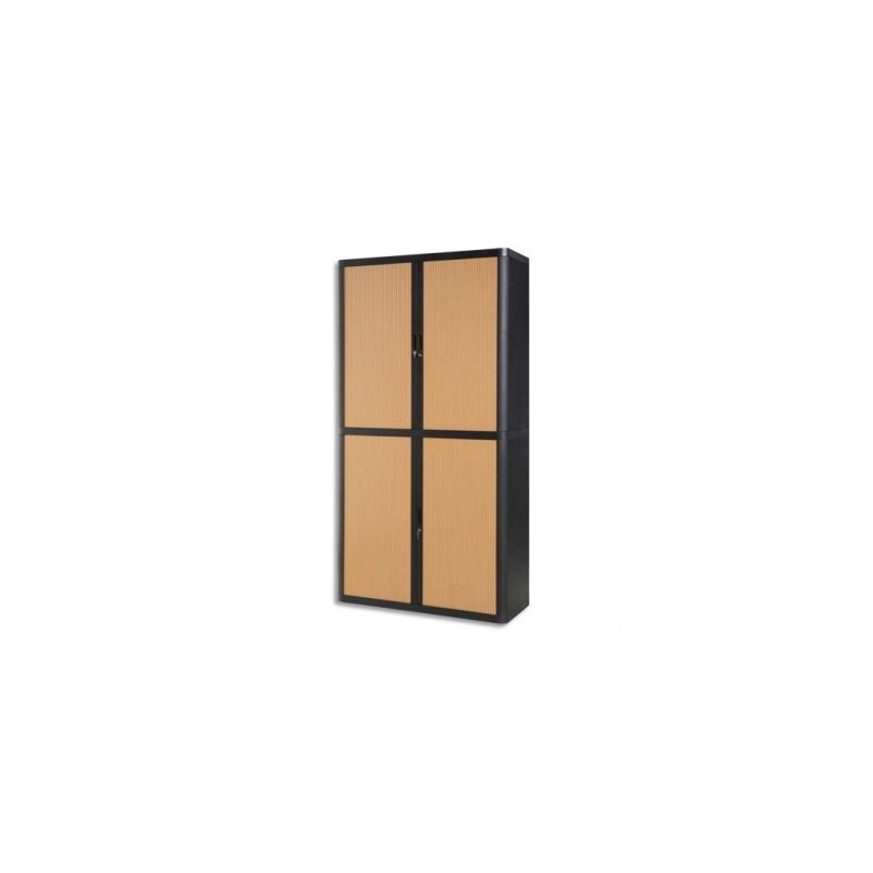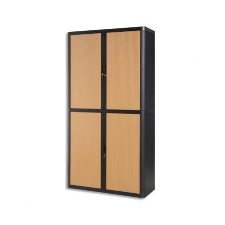 Structure métallique, corps en polystyrène teinté, résistant aux chocs et aux rayures. Rideau polypropylène, lamelles 15 mm, s'escamotant totalement dans les parois pour un accès et une visibilité totale du contenu de l'armoire. Poignées encastrées avec cache escamotable. Serrure à double sortie, livrée avec un jeu de 2 clés numérotées. Equipées de tablettes métalliques noires réglables tous les 8 cm avec replis pour dossiers suspendus. Charge utile jusqu'à 75 kg /tablette. Volume de classement par tablette : 80 dossiers suspendus, ou 11 classeurs dos 7,5 cm, ou 10 boîtes archives dos 8 cm. Dimensions utiles : L. 86 x P. 37,5 cm. Armoire Haute : L. 110 x H. 204 x P. 41,5 cm (4 tablettes). Sous ses allures classiques elle est révolutionnaire !