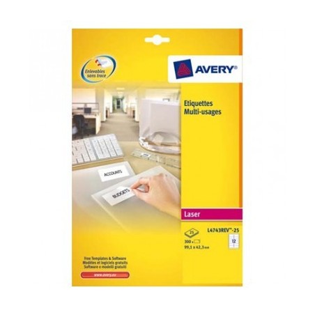 Compatibles avec toutes imprimantes laser. Adhérent parfaitement et se retirent facilement, sans trace de colle, ni résidus. Idéales pour l’identification flexible ou provisoire d’un produit, dos de classeur, rayonnage... Modèles et logiciels gratuit sur www.avery.fr Facile à enlever, sans trace !