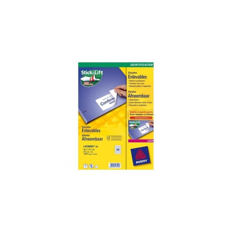 Compatibles avec toutes imprimantes laser. Adhérent parfaitement et se retirent facilement, sans trace de colle, ni résidus. Idéales pour l’identification flexible ou provisoire d’un produit, dos de classeur, rayonnage... Modèles et logiciels gratuit sur www.avery.fr Facile à enlever, sans trace !