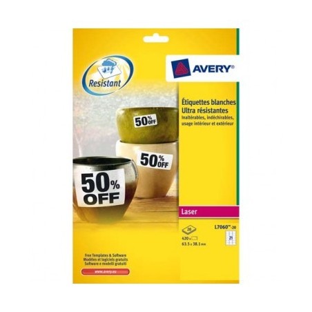 AVERY Boîte de 420 étiquettes laser inaltérables blanches 63,5 x 38,1 mm L7060-20