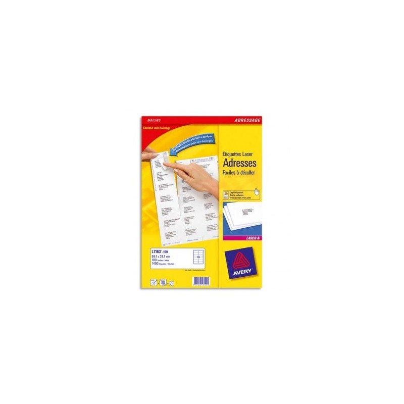 Garanties sans bourrage et compatibles toutes imprimantes laser. Faciles à décoller de la planche et rapides à appliquer grâce à la technologie "Facile à décoller". Ces étiquettes sont recyclables avec un adhésif à base d’eau et un emballage recyclé. Modèles et logiciels gratuits sur www.avery.fr. Étiquettes adhésives blanches.