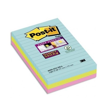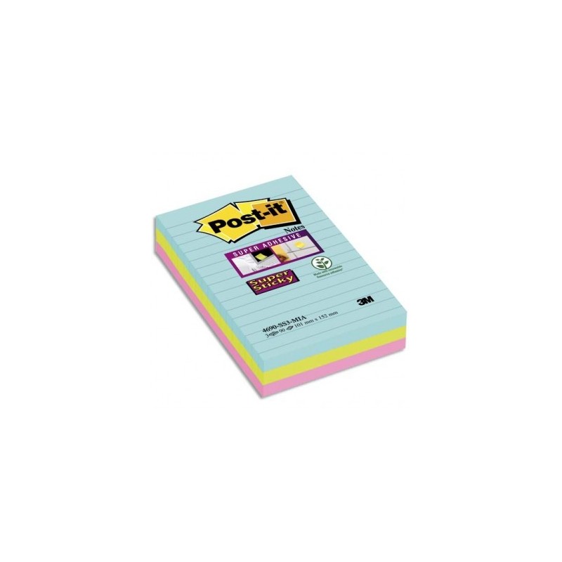 POST-IT Lot de 6 blocs notes Super Sticky Post-it® Grands Formats lignées MIAMI 102 x 152 mm, 90 feuilles