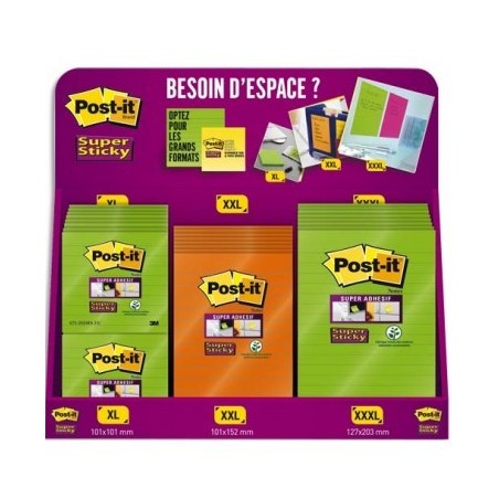 Présentoir contenant 36 notes lignées Super Sticky grand format. 12 lots de 3 blocs de 70 feuilles Notes Super Sticky 101 x 101 mm. Coloris vert, fuchsia, bleu. 12 lots de 3 blocs de 45 feuilles Notes Super Sticky 101 x 152 mm. Coloris orange, bleu, vert. 12 lots de 2 blocs de 70 feuilles Notes Super Sticky 127 x 203 mm. Coloris vert, fuchsia. Présentoir de notes.