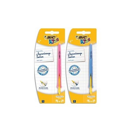 Butée pour un positionnement des doigts idéal. Idéal pour Gaucher ou Droitier. Pointe large (Ø 1mm). Encre bleue. Les blisters sont assortis (corps bleu et rose). Les stylos bille d'apprentissage